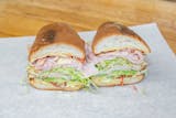 Italian mortadella, spicy chicken, fresh basil, fresh mozzarella, mustard and mayonnaise, honey mustard, tomato on a toasted roll.